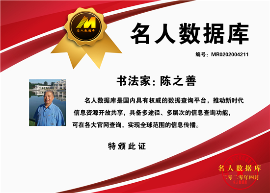 陈之善,男,河北廊坊人,1945年9月出生。 先后入学于河北地质学院、人民大学自学考试党政干部基础科、中国中央党校。曾任解放军某部政委、原纺织工业部机关党委副书记、中国纺织出版社社长兼党委书记等职。现任中国收藏家协会常务理事、中国书法家协会会员、中国书画收藏家协会会员、北京市书法家协会会员、北京市东城书法家协会监事长。