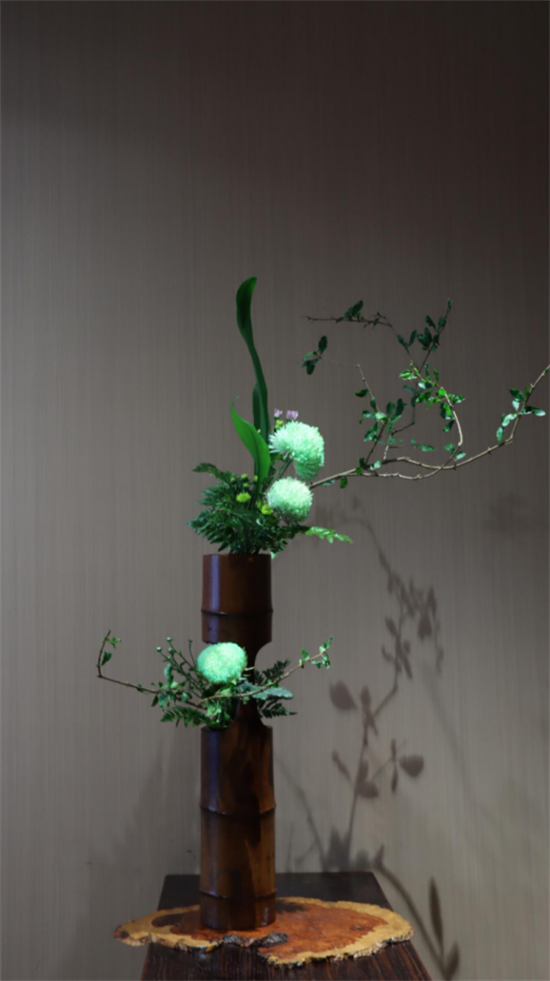 插花作品是人们利用自然界植物的花、枝、叶、果、根等为素材,经过巧妙的构思,遵循构图原理而创作出来的花卉艺术品。